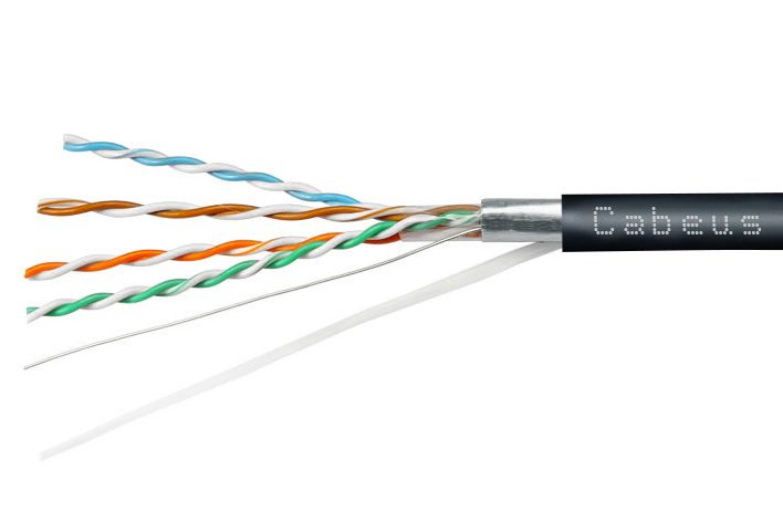 Четырёхпарный кабель категории 5e, построенный на основе витой пары, предназначен для систем передачи данных со скоростью до 2,5 Гбит/с. Изделие выполнено в экранированном варианте F/UTP и рассчитано на прокладку вне зданий.