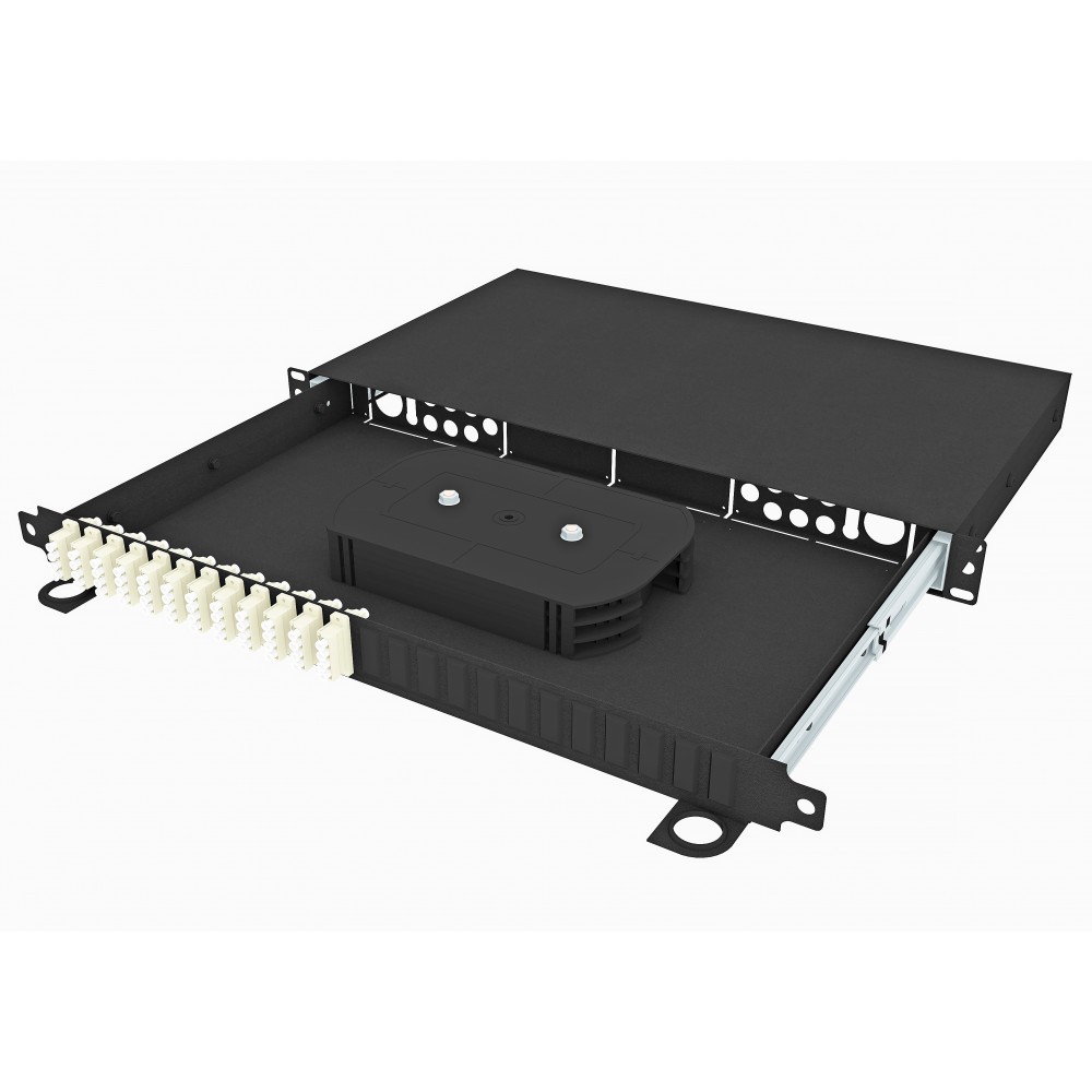 Кросс оптический стоечный выдвижной 19", 48 LC/UPC (24 DLC/UPC) адаптеров, многомодовый (50/125), 1U, черный, укомплектованный, TopLAN