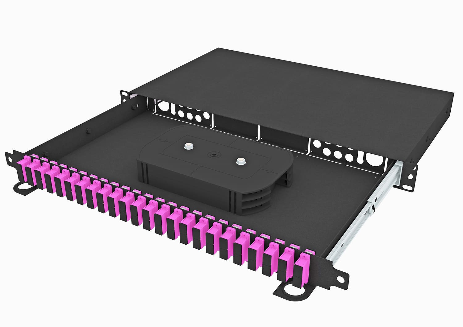 Корпус устройства изготовлен из листовой стали с антикоррозийным порошковым покрытием. Конструкция предусматривает возможность установки 1-2 сплайс-кассет. Глубина установки в стойку регулируется для удобства монтажа и обслуживания.