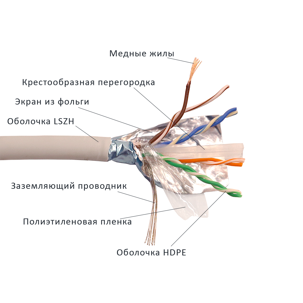 Каждый проводник защищён изоляцией из HDPE (полиэтилен высокой плотности). Две скрученные с особым шагом жилы формируют витую пару. Для минимизации помех между парами используется специальная крестообразная перегородка.