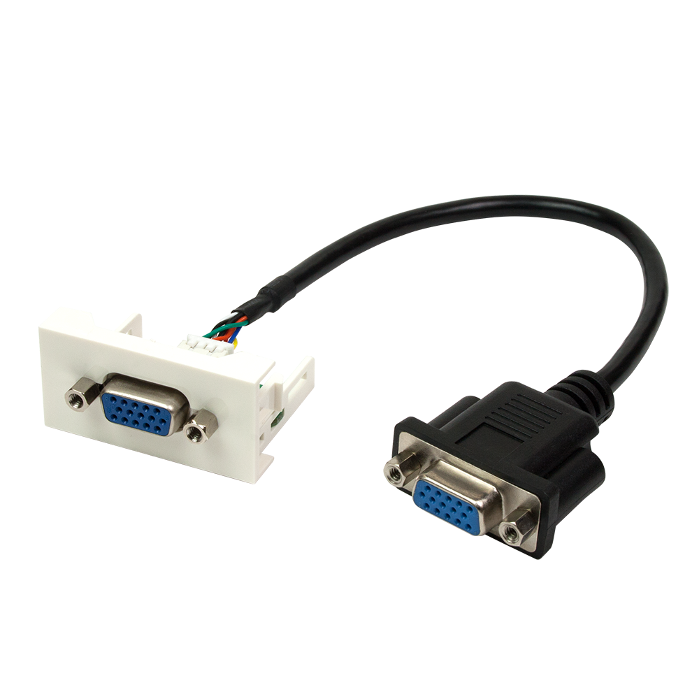 Лицевая панель предназначена для организации точек подключения мониторов или проекторов с разъемами VGA/SVGA D-Sub. С лицевой стороны модуль оснащен разъемом D-SUB (HDB-15) мама. С тыльной стороны панели находится удлинительный кабель длиной 20 см или 3 м. Кабель оконцован разъемом D-SUB (HDB-15) мама, обеспечивает удобное подключение VGA-кабелей, подходящих с внутренней стороны розетки.Информация об упаковке