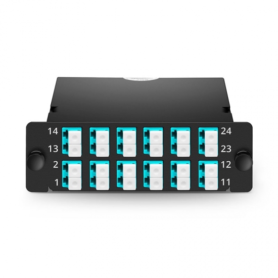 Кассета оптическая MPO имеет на задней панели 24х-волоконный адаптер MPO, соединенный с 12 адаптерами LC duplex на передней панели, к которым могут подключаться волоконно-оптические кабели высокой плотности для коммутации в центрах обработки данных.