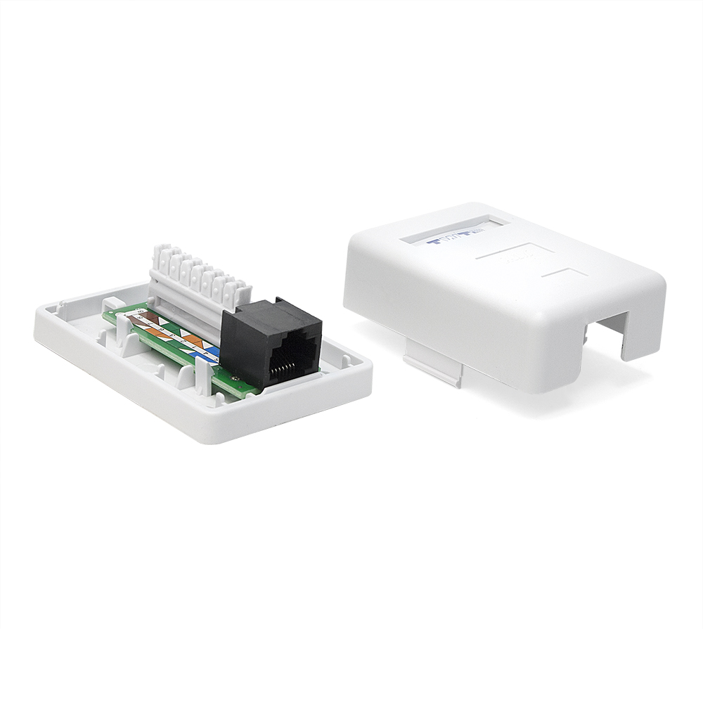 Однопортовая неэкранированная (UTP) телекоммуникационная розетка с портом RJ-45, предназначена для монтажа на стену. Порты розетки смонтированы на одной печатной плате вместе с разъемами IDC 110-го типа.